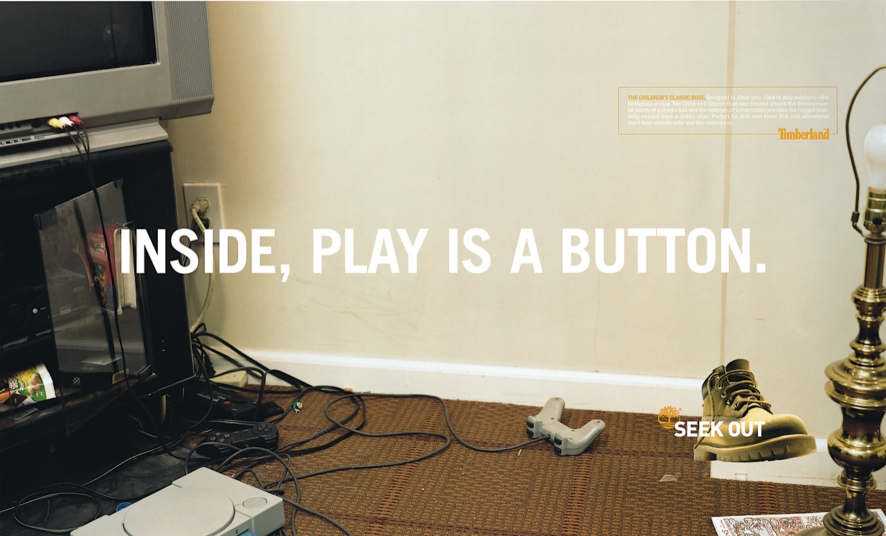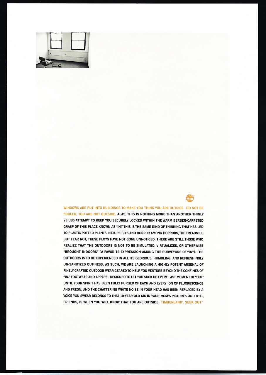 Windows are put into buildings to make you think you are outside. Do not be fooled, you are not outside. Alas, this is nothing more than another thinly veiled attempt to keep you securely locked within the warm berber-carpeted grasp of this place known as “in.” This is the same kind of thinking that has led to plastic potted plants, nature CD’s and horror among horrors, the treadmill. But fear not, these ploys have not gone unnoticed. There are still those who realize that the outdoors is not to be simulated, virtualized, or otherwise “brought indoors” (a favorite expression among the purveyors of “in”). The outdoors is to be experienced in all its glorious, humbling, and refreshingly un-sanitized out-ness. As such, we are launching a highly potent arsenal of finely crafted outdoor wear geared to help you venture beyond the confines of “in.” Footwear and apparel designed to let you suck up every last moment of “out” until your spirit has been fully purged of each and every ion of fluorescence and freon, and the chattering white noise in your head has been replaced by a voice you swear belongs to that 10-year-old kid in your mom’s pictures. And that, friends, is when you will know that you are outside. Timberland. Seek Out.